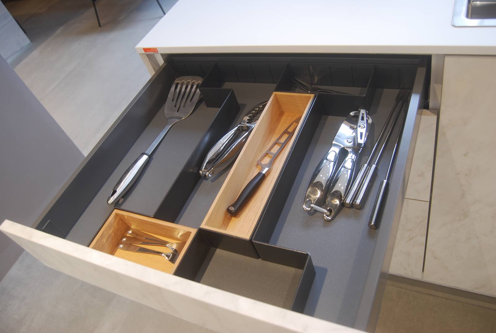 L'aménagement intérieur est un élément important dans une cuisine. Que celle-ci soit grande et fermée ou petite chaque cuisine créée par nos décorateurs est pensée pour gagner un maximum d'espace de rangement et notre fabricant de cuisines SCHRODER cherche toujours de nouvelles innovations pour optimiser ses tiroirs de rangement.
