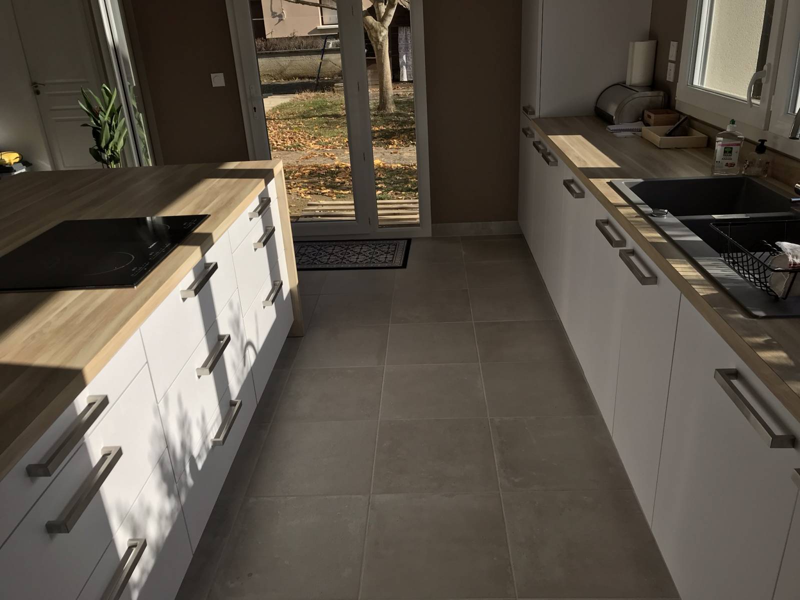 Accueil / Nos réalisations / Cuisine Blanche avec Plan de travail Stratifié Bois - Cuisiniste à Saint Priest