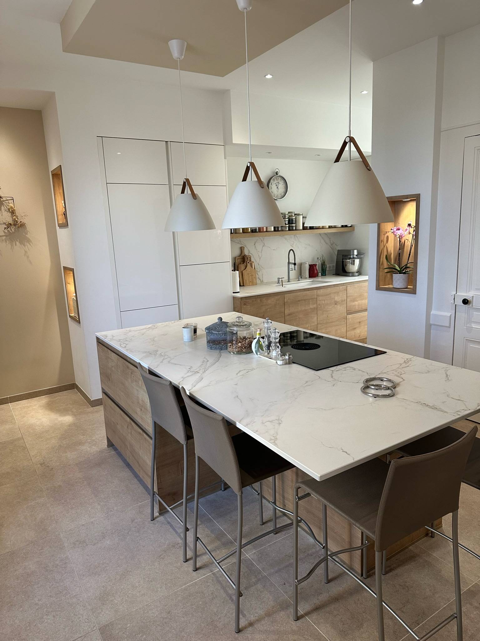 Cuisine blanche et bois avec plan de travail Dekton à Lyon