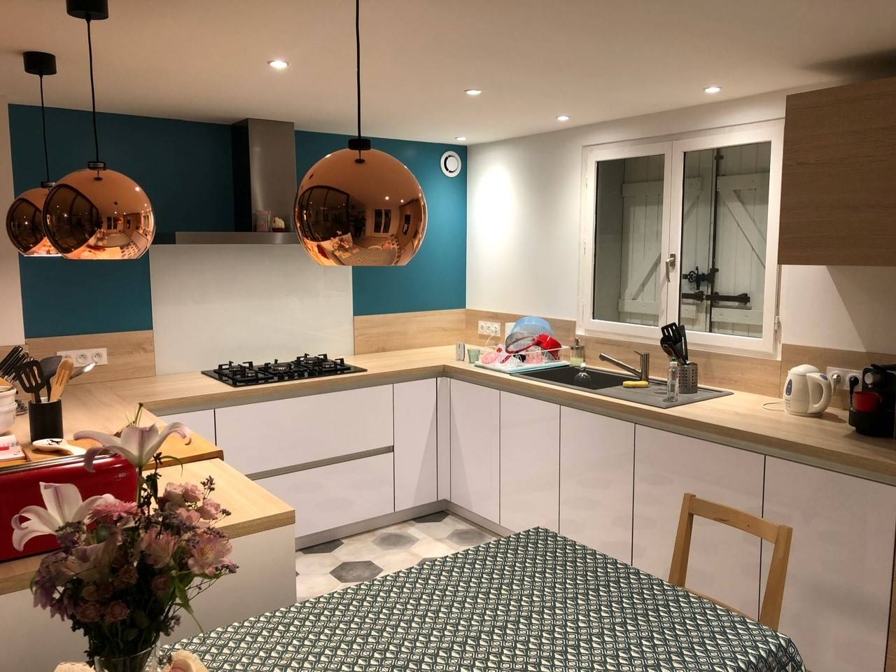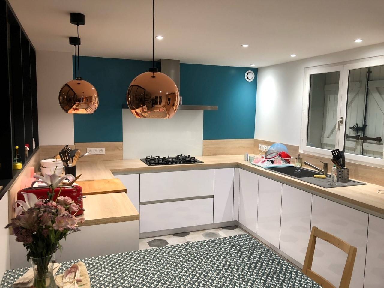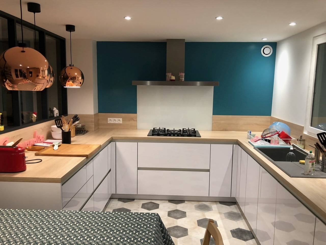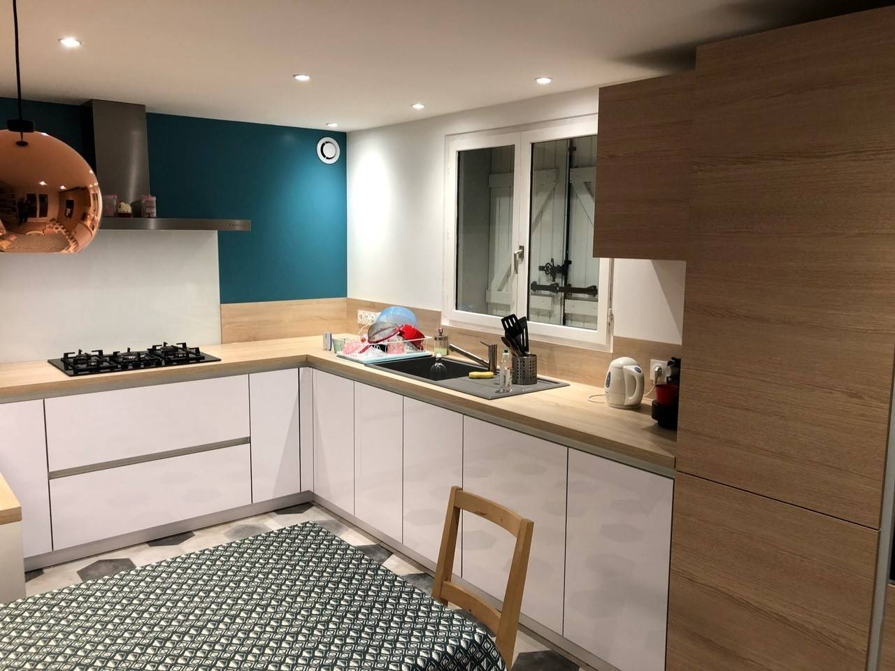 Accueil / Nos réalisations / Cuisine Blanche et Bois avec Plan de Travail Stratifé - Cuisiniste à Vienne