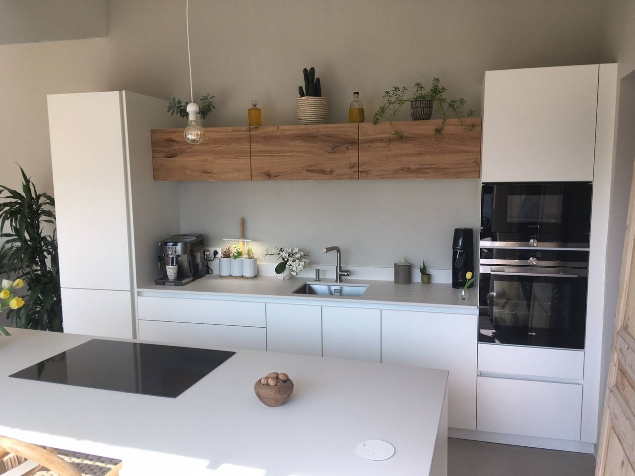 Cuisine blanche et bois et plan de travail Dekton Zenith - cuisiniste à Lucenay