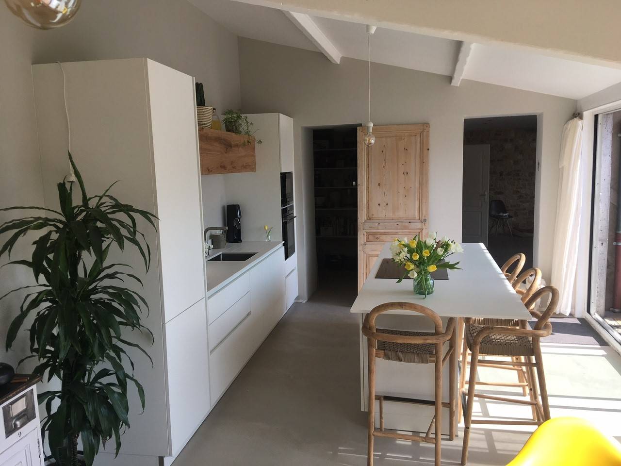 Cette cuisine installée à Lucenay a des façades en stratifié blanc pour les meubles bas et le meuble de l'ilot et des façades en plaquage bois pour les meubles haut. Cette cuisine se fond parfaitement dans cette maison de campagne complétement rénové.