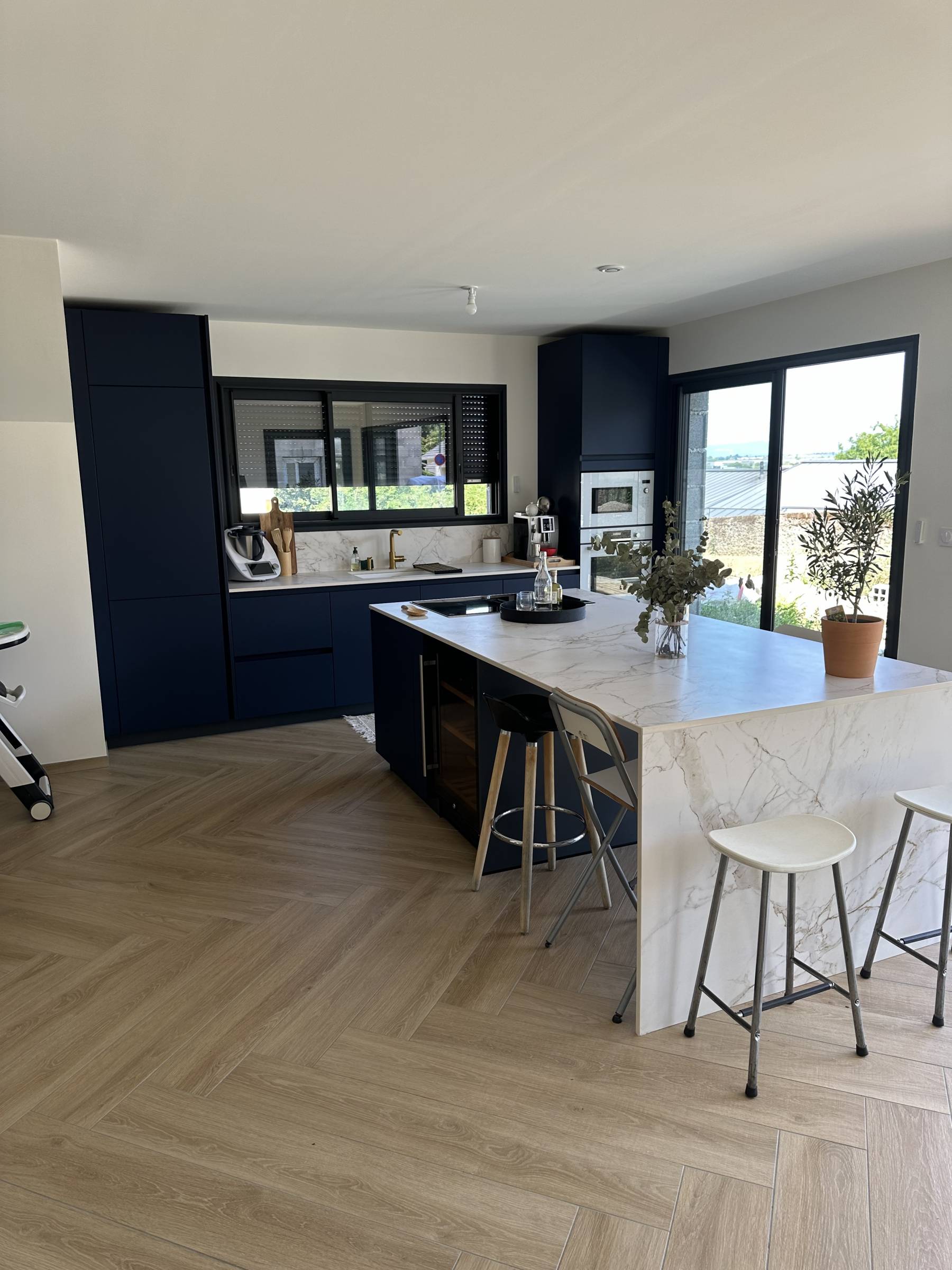 Nous avons donc proposé une cuisine avec un îlot central permettant un lien entre le salon et la cuisine. Nos clients peuvent discuter en cuisinant ce qui rend la cuisine conviviale