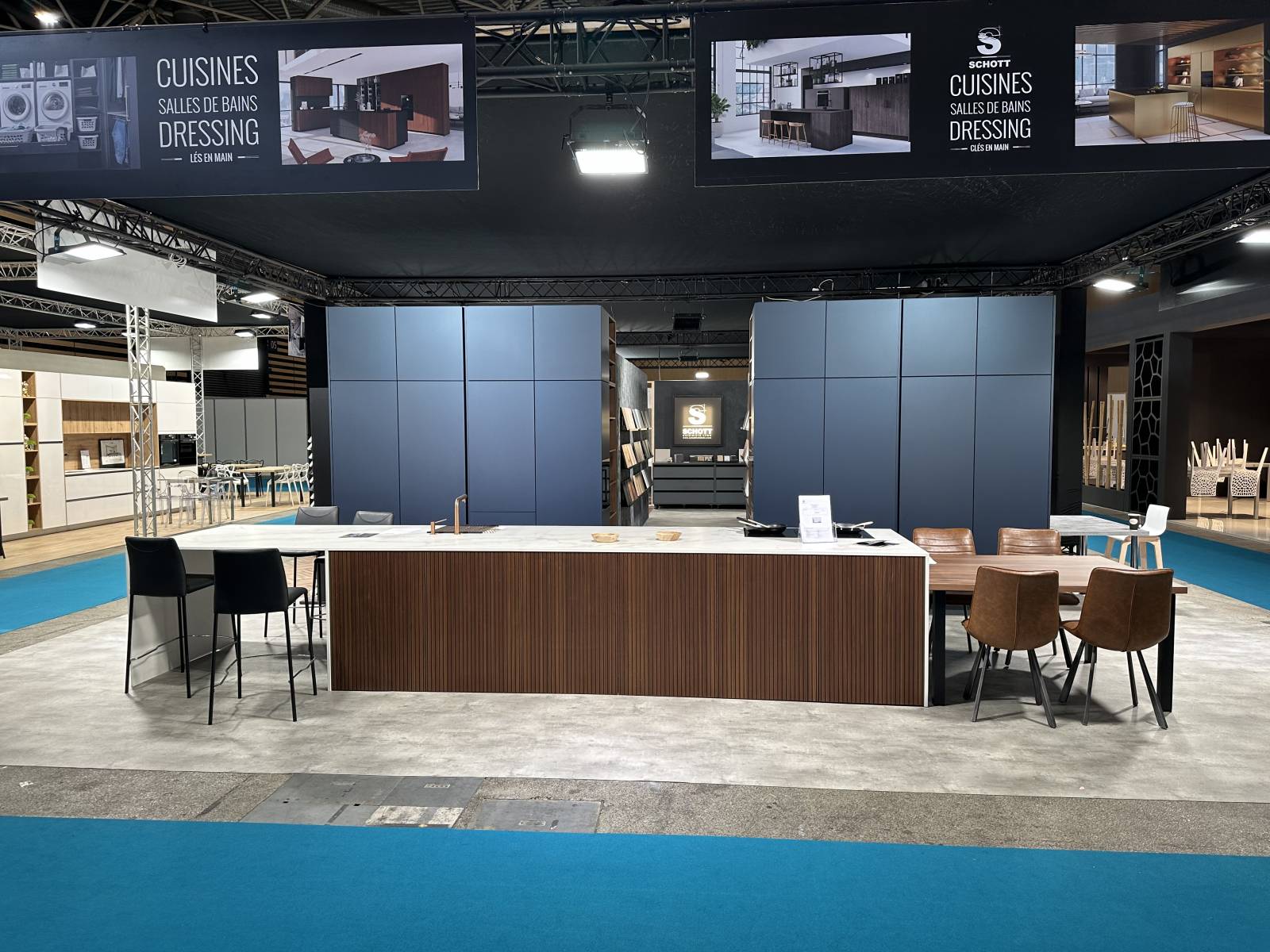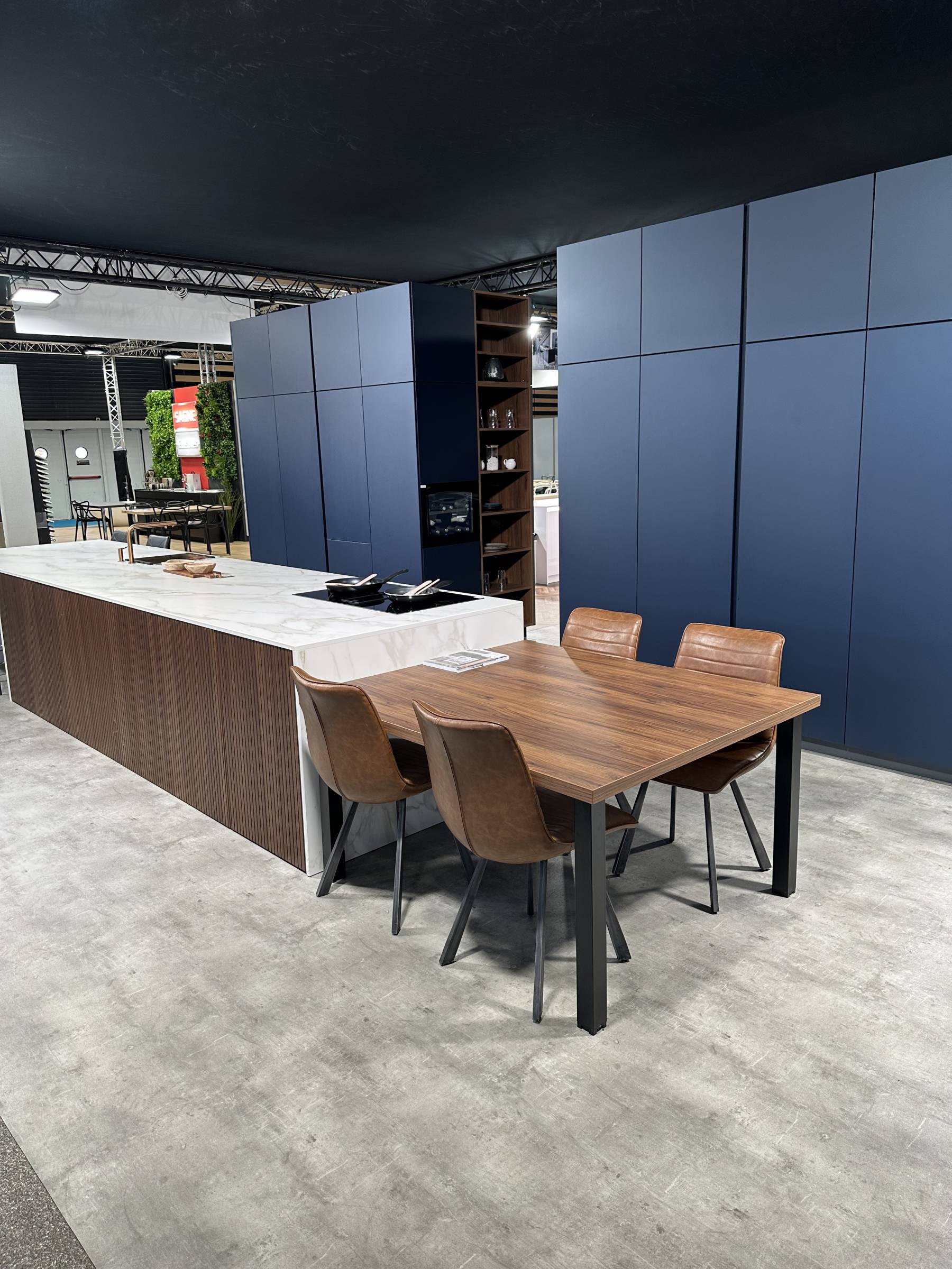 Comme nous vous l'avons expliqué plus haut nous avons lors de la foire de Lyon 2023 associé le bleu des facades de cuisine avec un matériau tel que le bois. Cette association créera une atmosphère chaleureuse et accueillante dans votre cuisine à Lyon. Le bois apporte une touche d'authenticité et de convivialité, tandis que le bleu renforce le côté cosy et détendu de l'espace. Optez pour des meubles en bois clair ou foncé, selon vos préférences, et complétez l'ensemble avec un plan de travail en dekton ou stratifié blanc uni ou marbré.