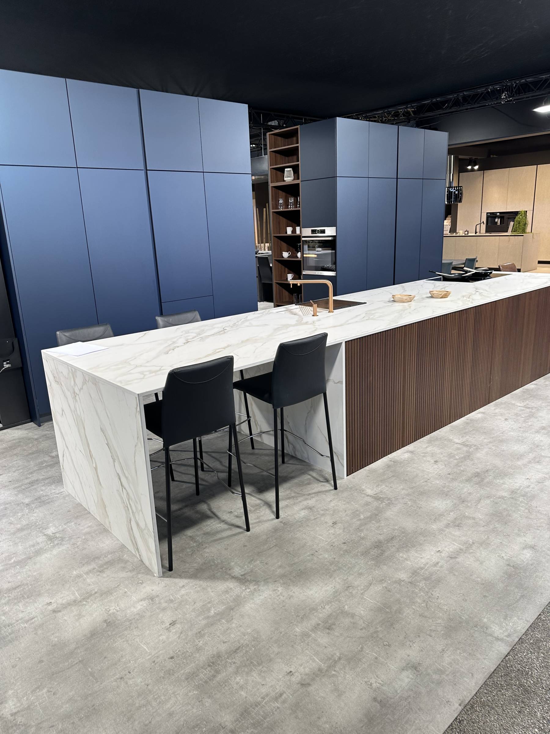Nos facades bleues créent une vraie plus value en terme de décoration et donnent à votre cuisine un design moderne. Dans cette cuisine présentée lors de la foire de Lyon 2023 nous avons fait le choix d'associer le bleu à du bois sur les façades de l'ilot et un plan de travail blanc veiné (DEKTON MORPHEUS) afin de pas avoir une cuisine trop foncé. Lors de cette foire, cette association de couleurs a été un réel succès auprès de nos clients et futurs clients.
