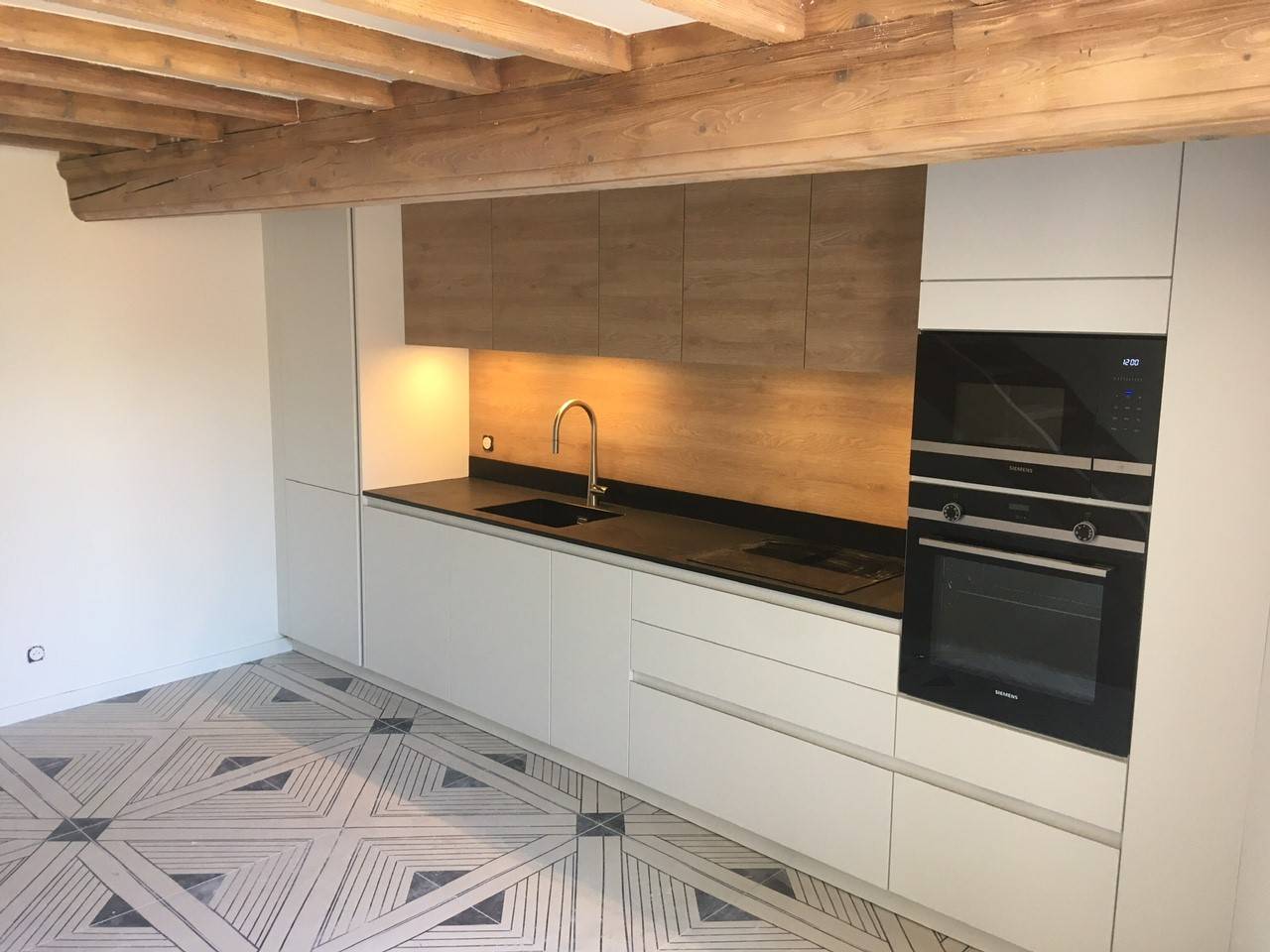 Nous sommes donc parties sur implantation en linéaire, le frigo est complètement encastré dans une armoire afin d’avoir un esthétique des plus épuré, la crédence en bois s’accorde parfaitement avec le plafond à la française. Mention spéciale pour le choix original du carrelage !