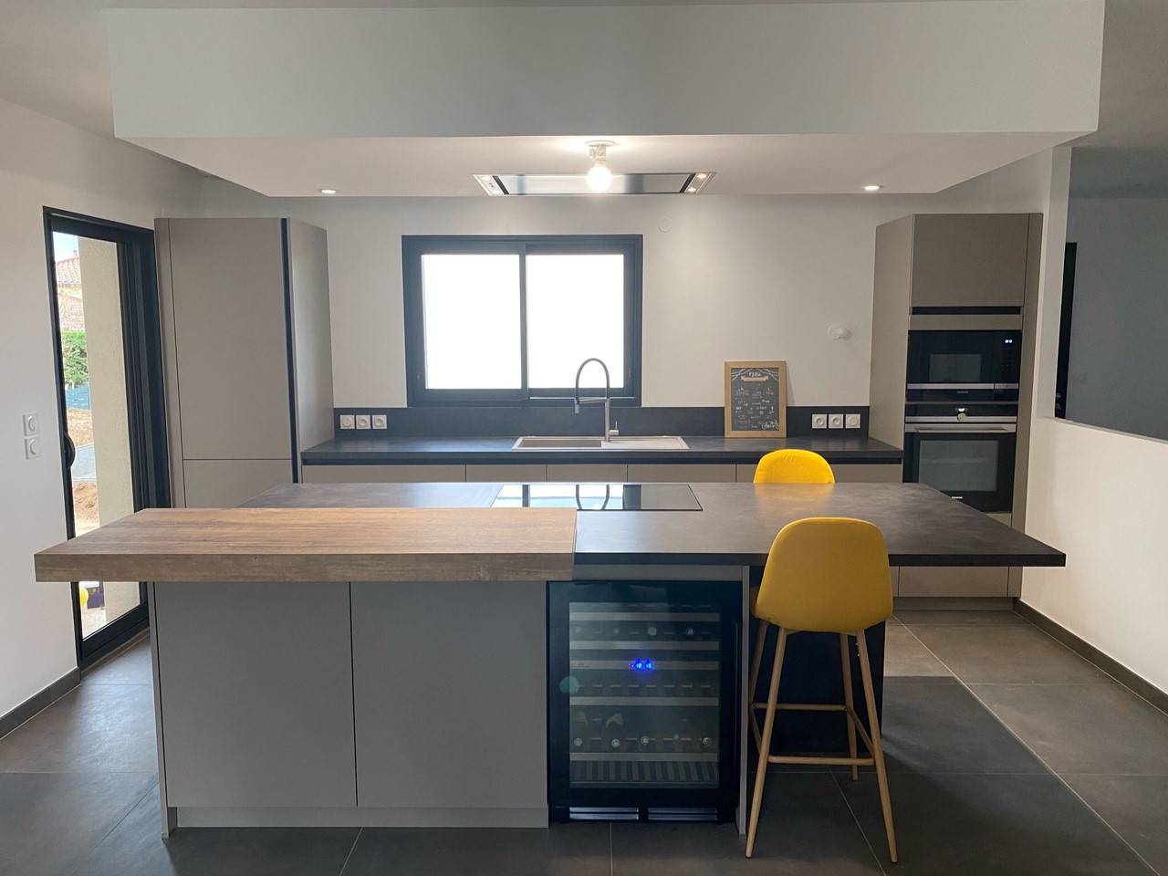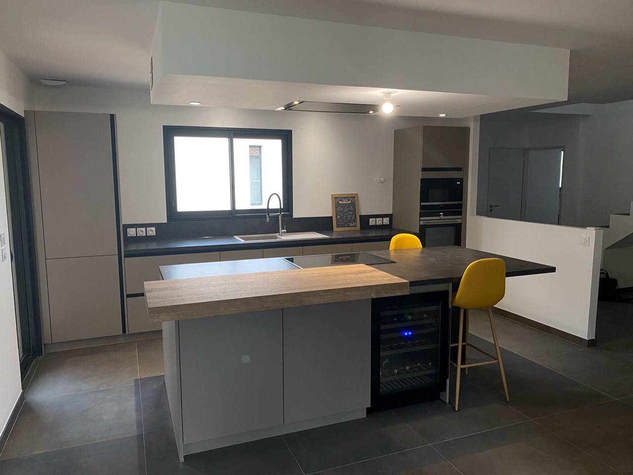 Nos clients souhaitaient des couleurs chaleureuses nous sommes donc partie sur un taupe/kaki avec des façades sans poignées, le faux plafond avec sa hotte intégré épouse parfaitement l’ilot, la cuisson centré sur l’ilot permet d’avoir un espace de plan de travail agréable, le petit plus : la cave à vin coté pièce de vie pour allier déco et apéro !