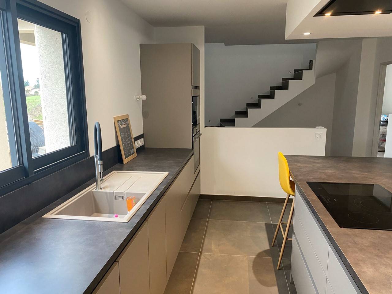 Accueil / Nos réalisations / Cuisine claire avec plan de travail stratifié Ardoise - Cuisiniste La Tour De Salvagny