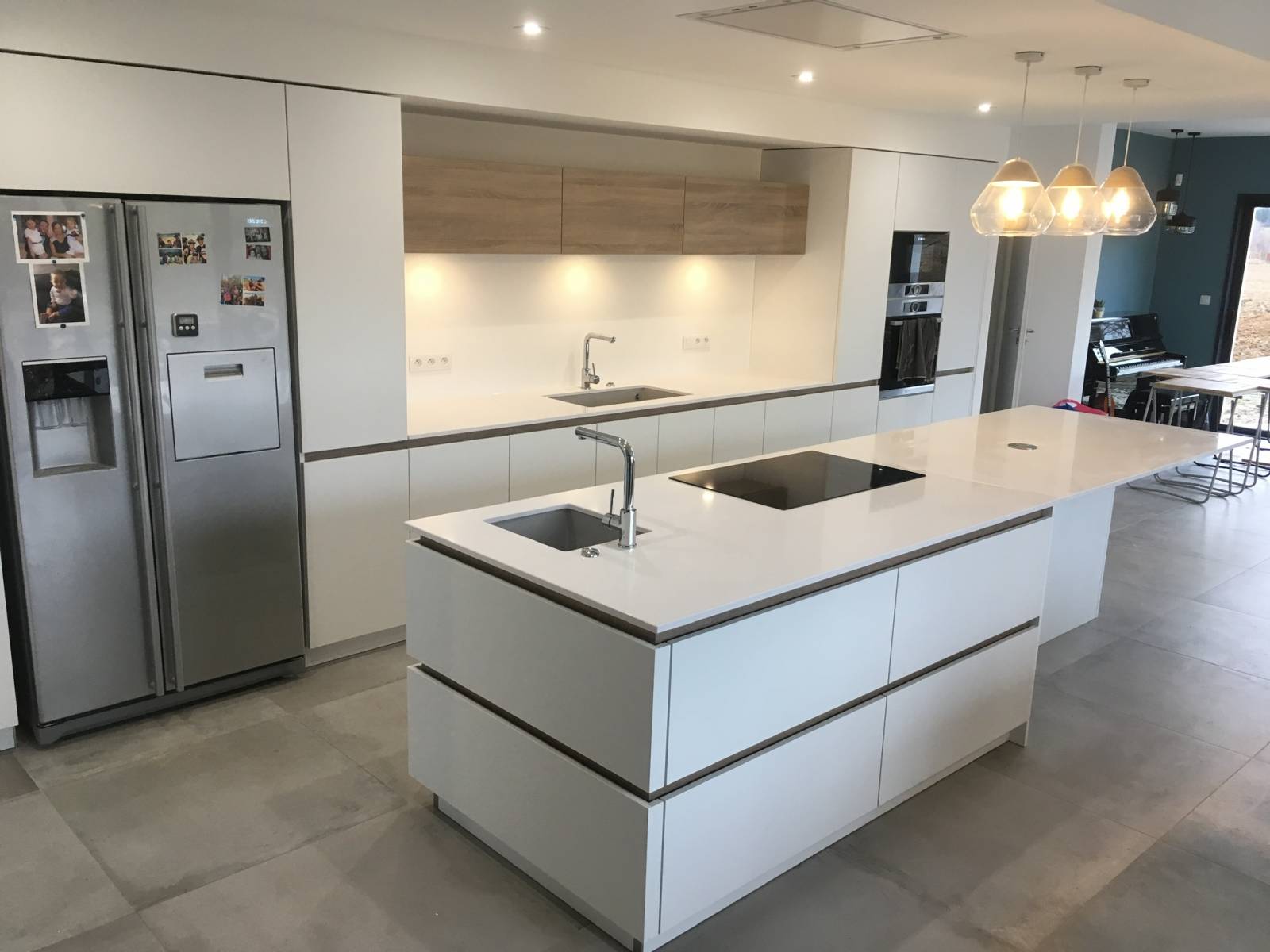 L’avantage d’une cuisine blanche est la possibilité de choisir dans de larges gammes de matériaux nobles et de teintes. Une cuisine aménagée et équipée blanche, s’accorde parfaitement avec une décoration de cuisine en bois. Pour une atmosphère conviviale et chaleureuse, l’ajout d’éléments de cuisine en bois massif, pin, chêne, noyer ou mélaminé est à favoriser. Le bois s’associe très bien avec des matériaux tels que le corian, le quartz, le granit, la résine, le ciment, la céramique ou encore une crédence ou des carreaux blanc laqué.
