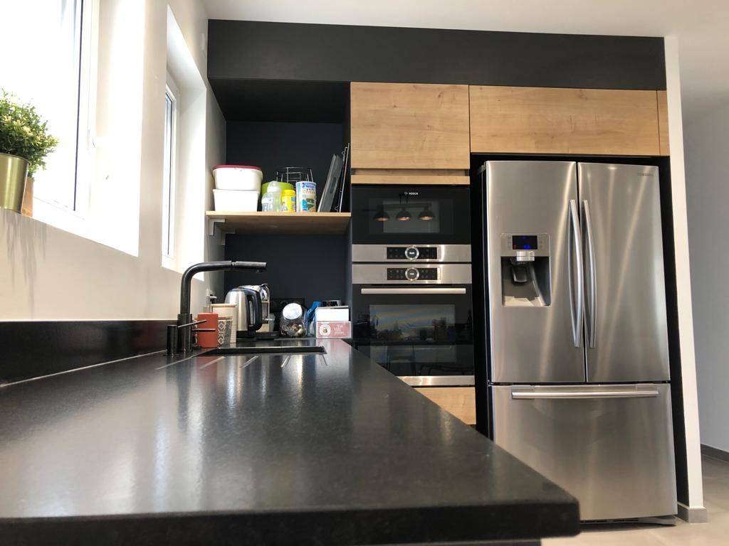 Découvrez la cuisine moderne noir et bois, installée à Villefranche-sur-Saône. Notre agenceur et nos poseurs ont conçu une cuisine ouverte avec îlot central, équipée de plaques de cuisson et d’une hotte aspirante. Cela a permis d’agrandir la pièce et nos clients sont ravis de leur belle cuisine, qu’ils disent « idéale pour la préparation des repas » !