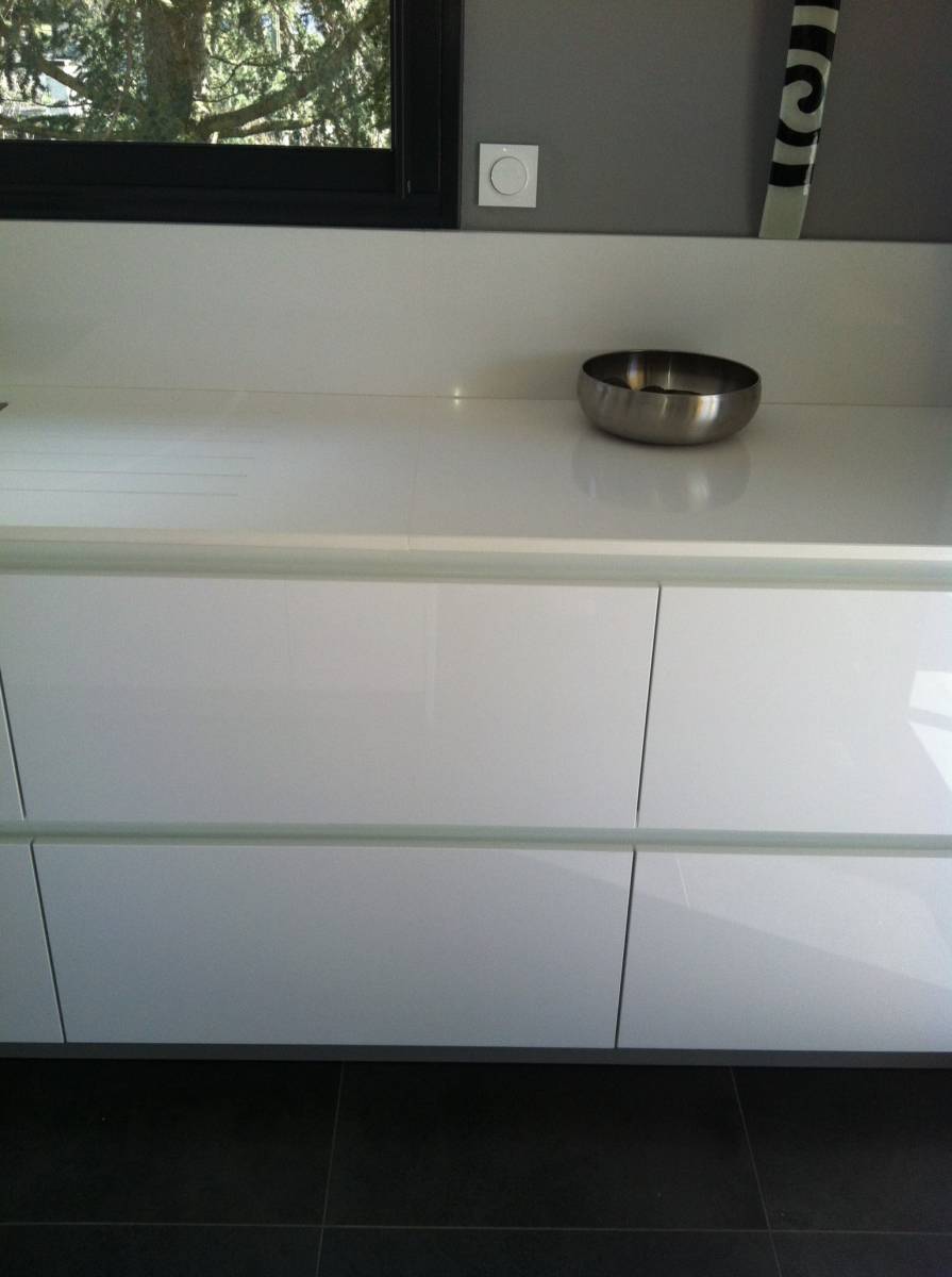 Pour donner un style design et épurée à cette cuisine il a fait le choix de travaillé sur des facades laquées blanche et un plan de travail en quartz blanc.