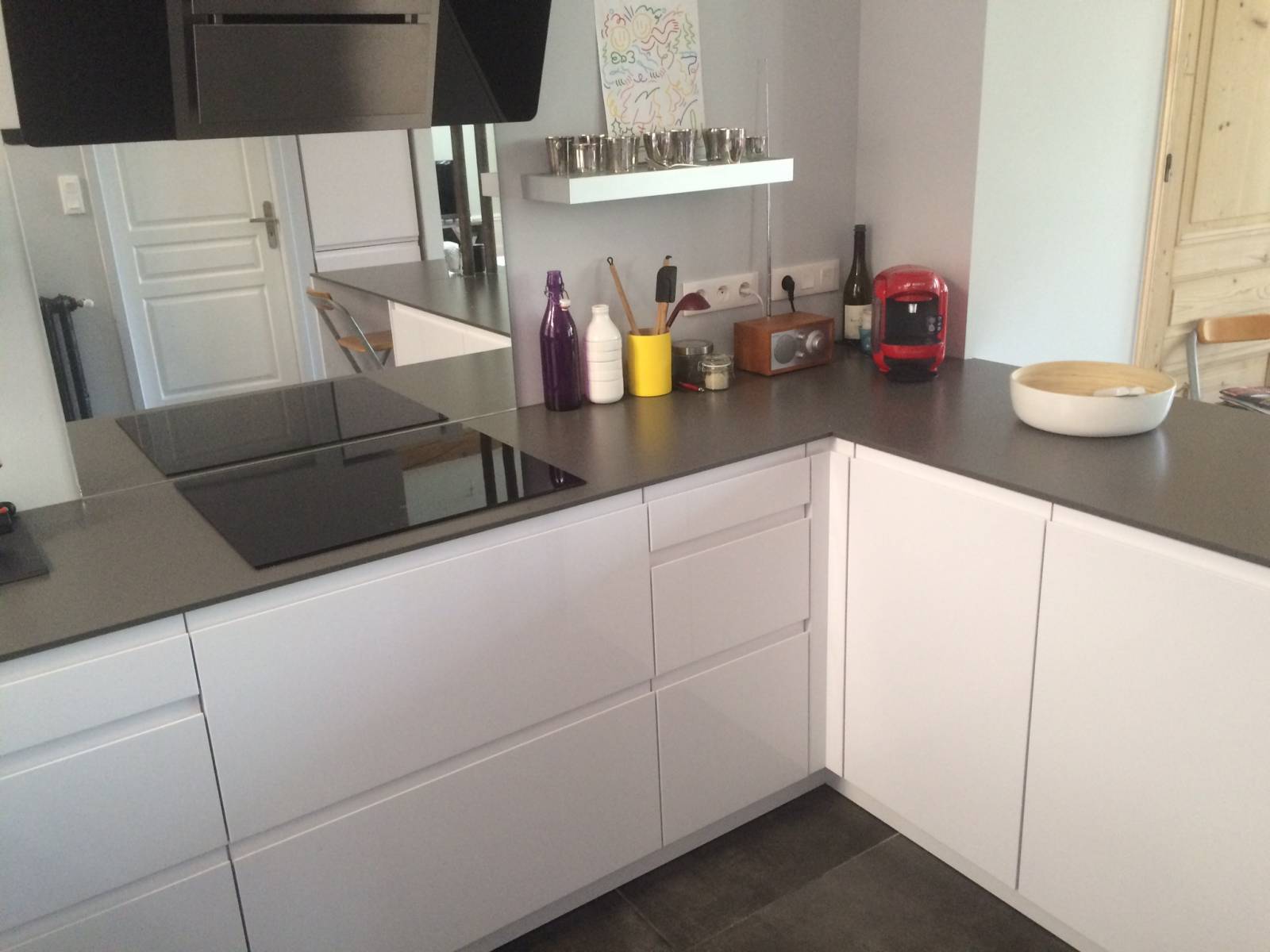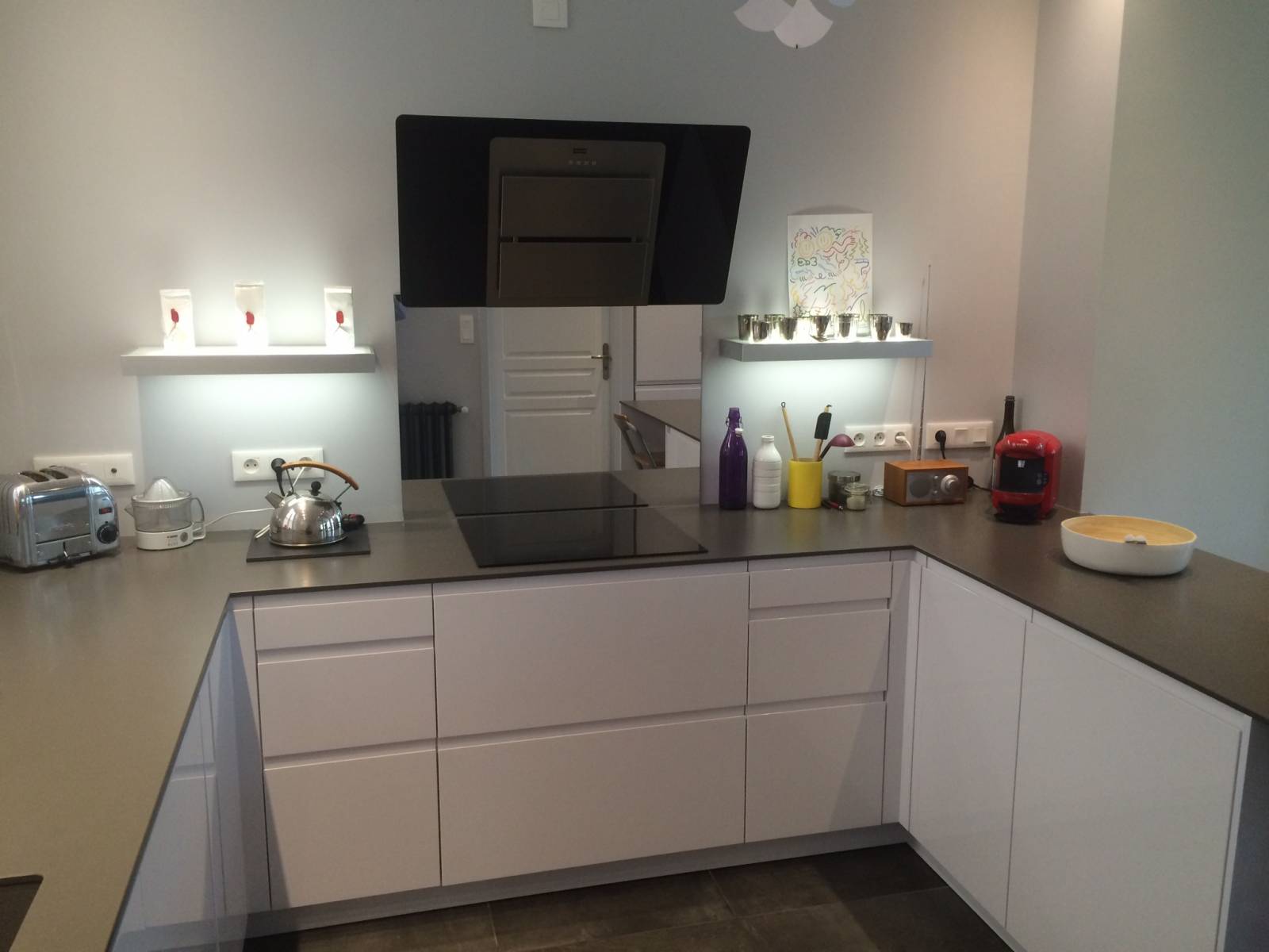 Notre décorateur a conseillé des façades de cuisines blanches laquées sans poignées et un plan de travail en céramique de 12 mm.