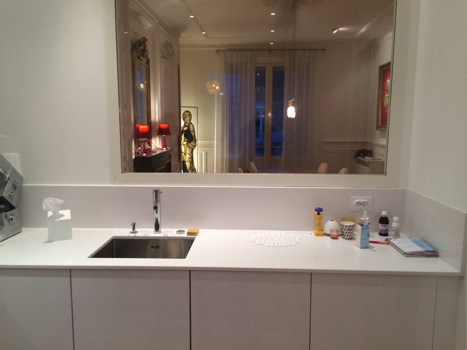 • Chez Pauline et Romain dans le 6ᵉ arrondissement, une cuisine immaculée avec des façades blanc mat et un îlot en pierre anthracite sublime leur espace avec une élégance discrète.
